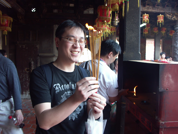 滿足了口腹之慾以後,買了一把20元的香,來給媽祖拜拜去!來到天后宮學到了幾個有趣的小知識:(1)媽祖的臉是黑的,不知道是不是因為被眾多信徒的香給燻黑了 :P (2)原來插進香爐的香一定要單數,不能偶數枝 (3)按照習俗,拜拜得從側門進出,應該為了要尊重神明吧。另外一件有趣的事情發生在供奉月下老人的廳堂中,我拿著香很大聲的說「月下老人幫幫我吧!」,結果把旁邊的同學和路人笑翻了。這趟旅程中的兩個遺憾,一個是沒有去擲筊,另一個則是沒有跟到媽祖繞境,因為大甲媽到彰化已經是禮拜天,而我當時已經在高雄了,所以只好明年再跟囉!