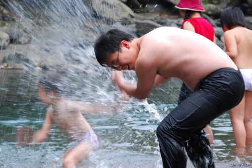 吃過午餐以後就開始往回走了,但因為沒玩到水很不爽,我臨時提議到烏來國小下面的溪邊去玩水。在過去的路上發生了一件小意外,因為我們家的車子走錯路,結果在倒車的時候車屁股撞到旁邊的路障,板金被刮了一大塊(內心OS:反正車子不是我開的,刮到也不甘我的事」)。烏來國小下面的溪邊上次跟彥中濟顛他們已經有去過一次,環境還算OK,而且當天太陽也不會很大,曬起來滿舒服的。一下到溪邊我馬上拖了衣服就跳進溪裡,那種冰涼徹骨的感覺不是一個爽字可以形容的^^!